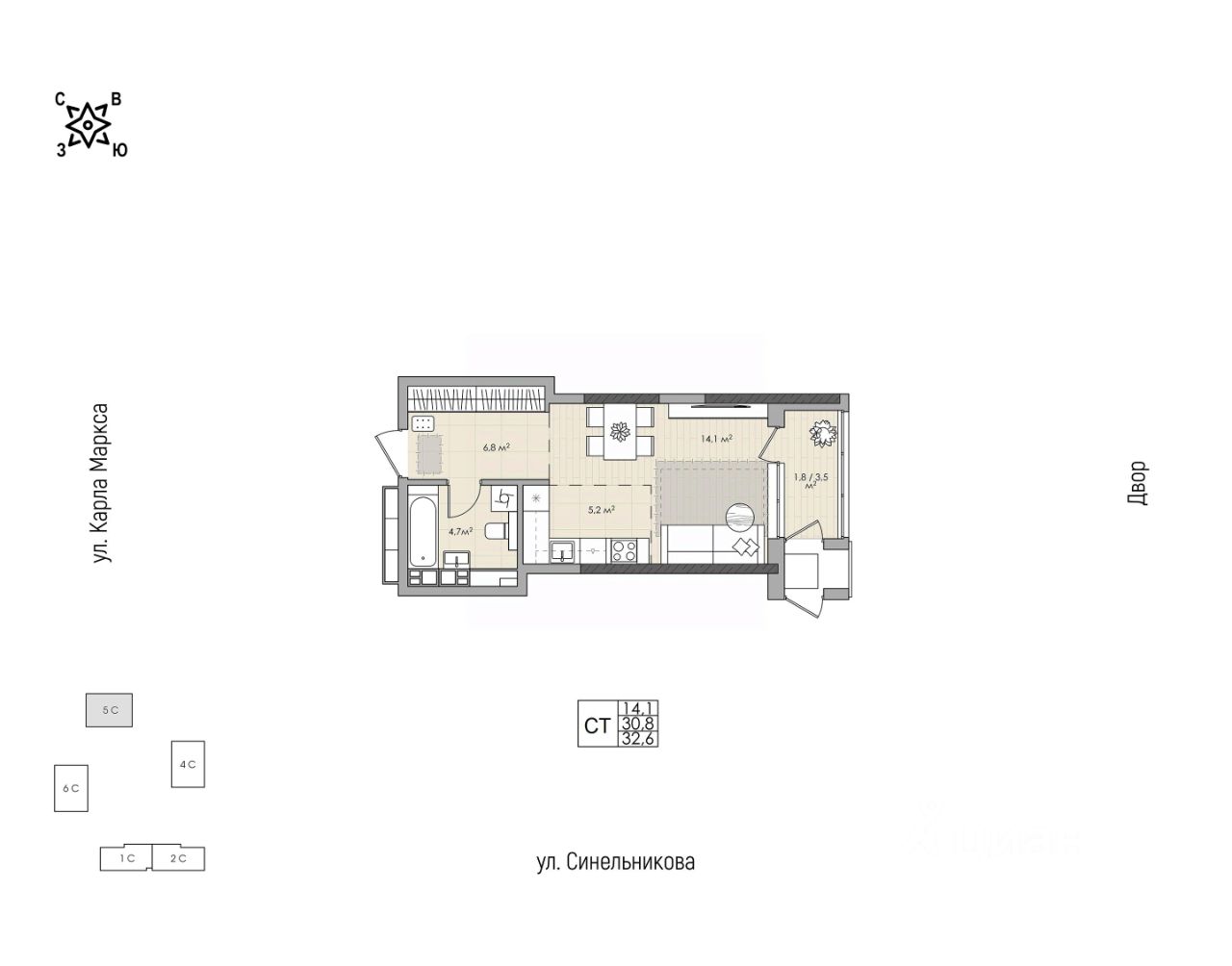 Основная комната позволяет с комфортом расставить мебель для готовки, отдыха и приёма гостей;