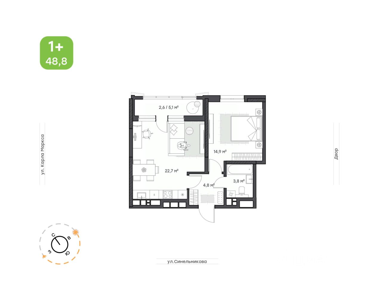Отличный пример того, как разделить квартиру на приватную и социальную зоны. Для тех, кто привык активно проводить вечера в приятной кампании - вместительная гостиная и лоджия в вашем распоряжении. Для кухонного гарнитура предусмотрена ниша, чтобы больше полезного пространства осталось для общения.