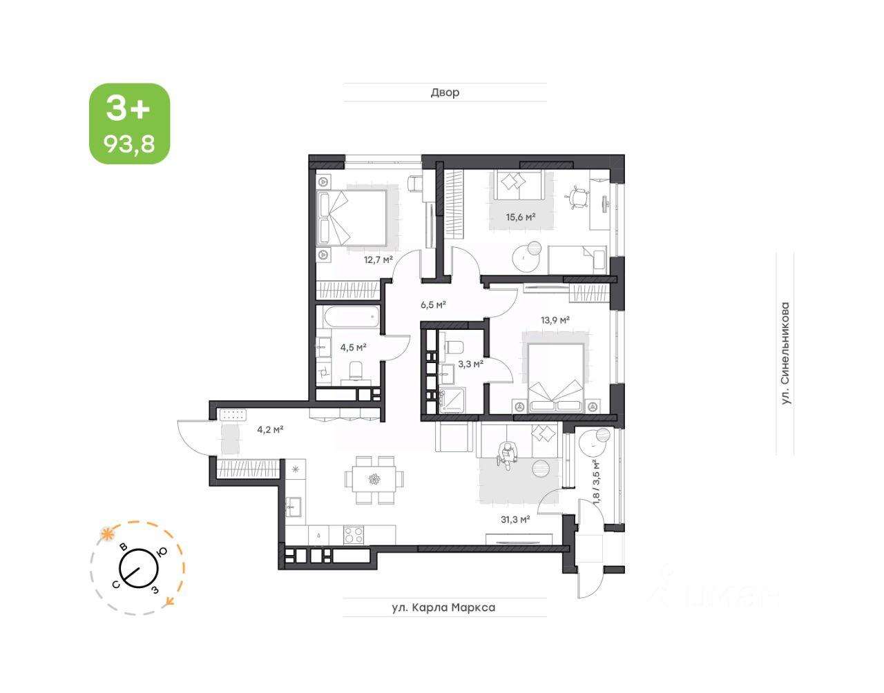 3,5-комнатная квартира для большой семьи с двумя детьми; Кухня-гостиная с лёгкостью вместит всю желаемуе мебель для готовки, отдыха и приёма гостей; Родительская мастер-спальня с собственным санузлом и гардеробной нишей; Детские спальни позволят делать расстановку мебели под "настроение"; Большое количество гардеробных ниш сэкономит деньги на покупку дополнительных шкафов и комодов; Окна на две стороны света обеспечат квартиры естественным освещением; Два санузла