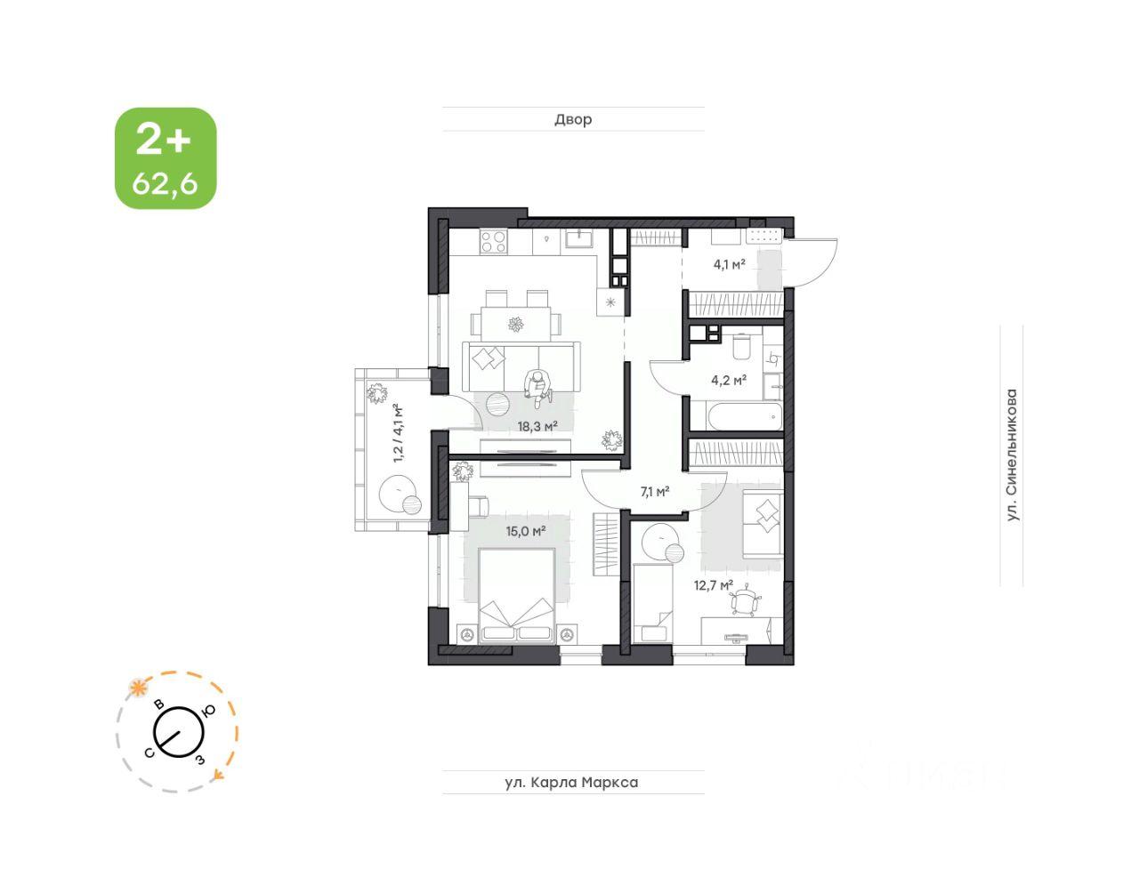 Окна на две стороны света обеспечат квартиру естественным освещением;