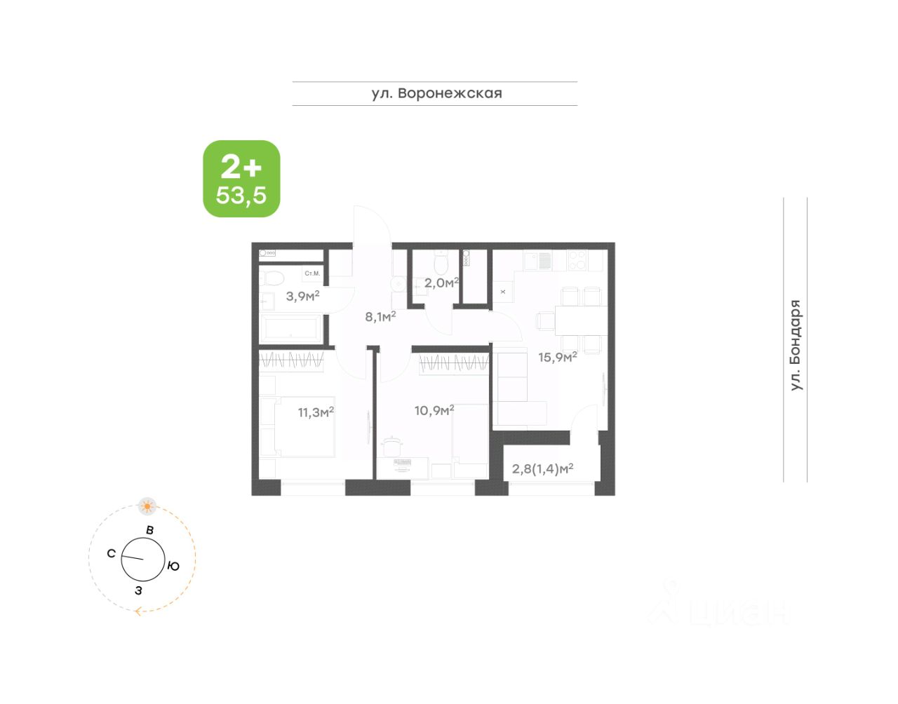Двухкомнатная квартира европланировки • Просторная прихожая 8,1 кв.м. с нишей под гардеробную места для гардероба и мебели; • Просторная кухня-гостиная 15,9 кв.м. с выходом на лоджию; • Две спальных комнаты правильной геометрической формы с зоной для хранения; • Наличие двух санузлов обеспечит комфорт даже для большой семьи; • Окна выходят во двор.