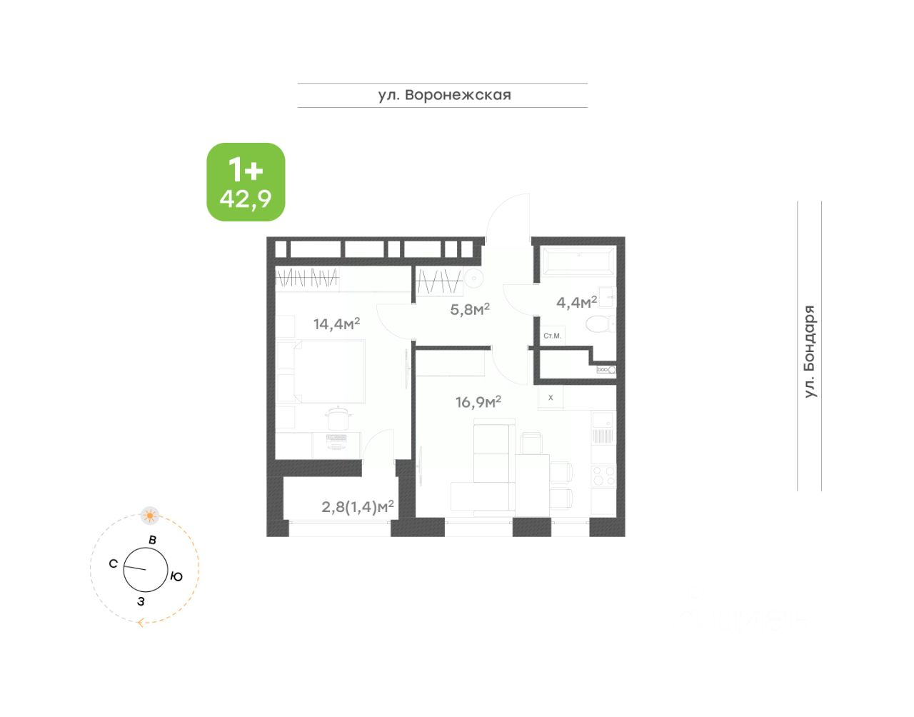 • Просторная кухня-гостиная с двумя окнами наполняется светом, создавая атмосферу уюта.;