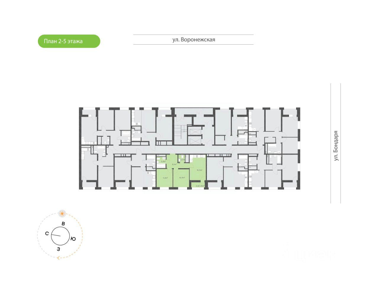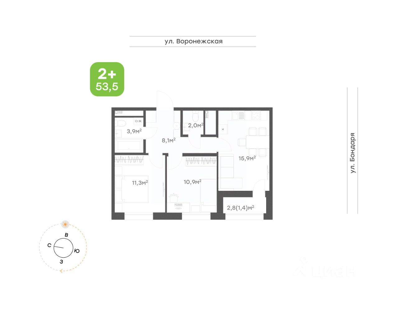 • Две спальных комнаты правильной геометрической формы с зоной для хранения;