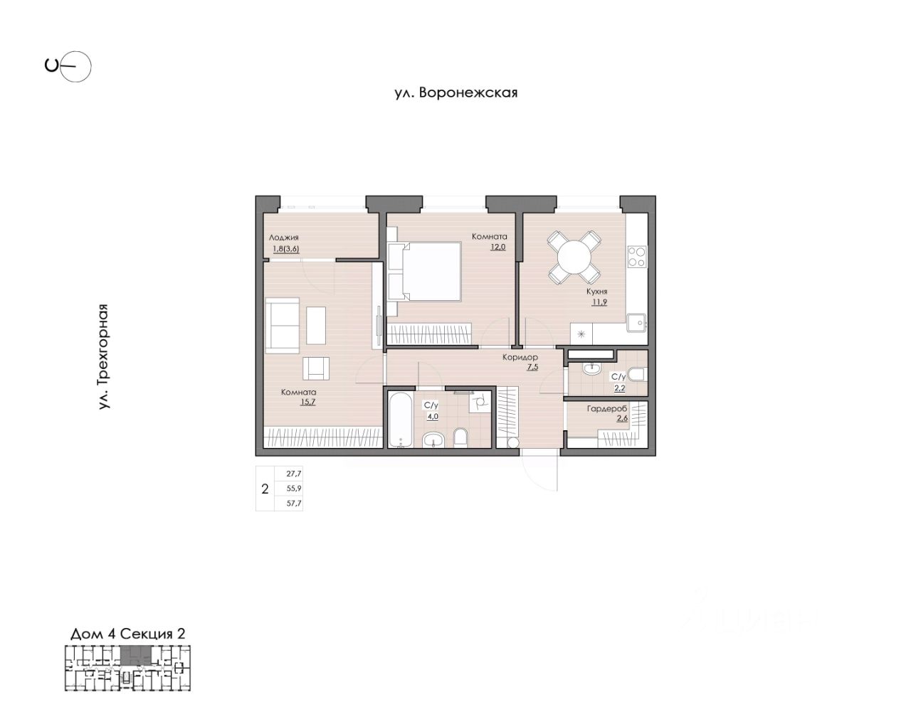 В квартире гардеробная комната, все окна выходят на ул.Воронежская.