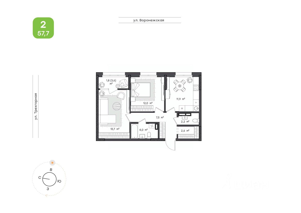 В квартире гардеробная комната, все окна выходят на ул.Воронежская.