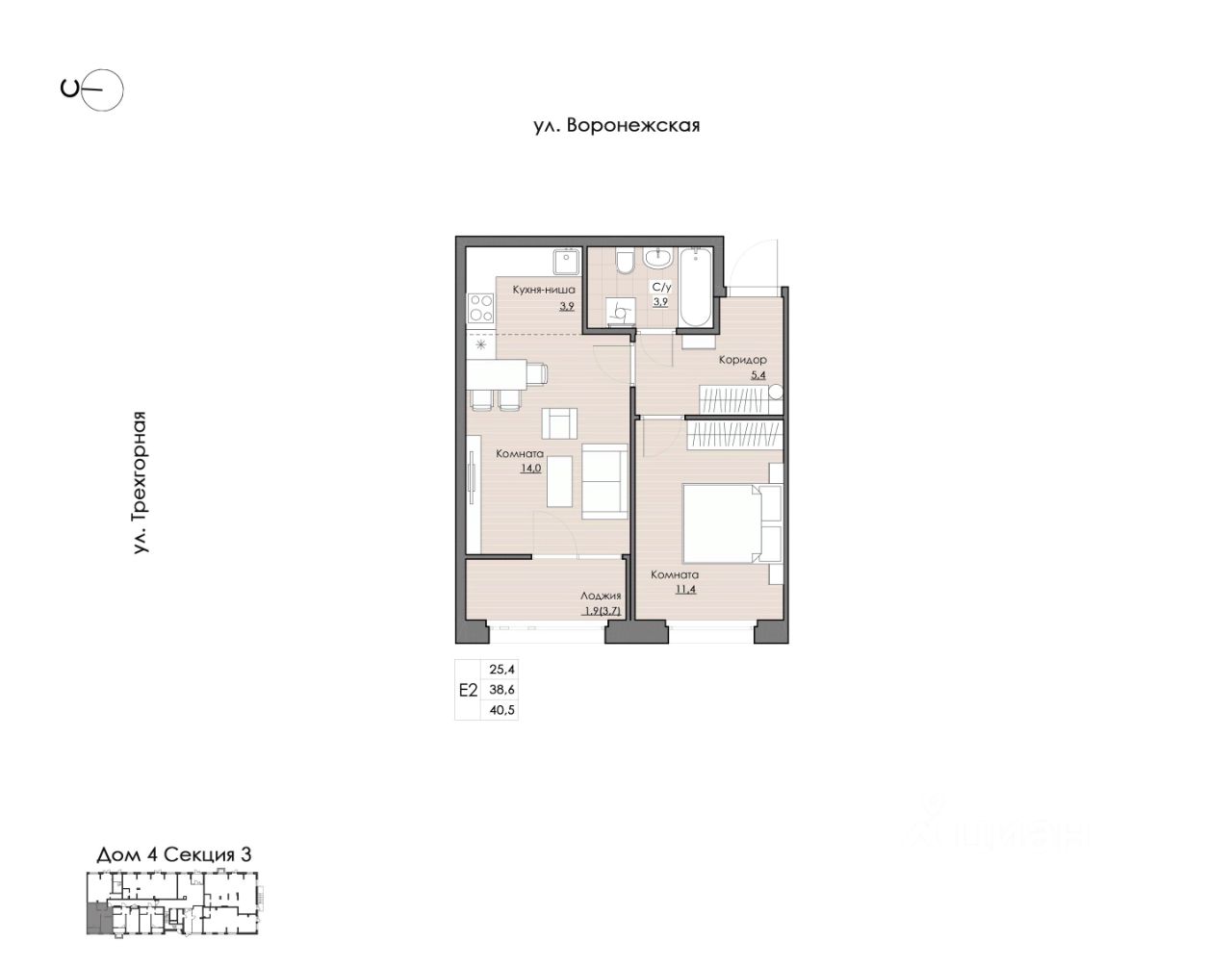 Интересная особенность - кухня-гостиная с нишей под гарнитур и возможностью установить барную стойку.
