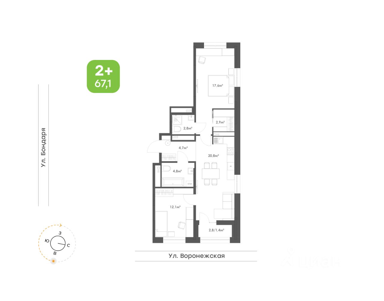 Двухкомнатная квартира евроформата с окнами на 3 стороны света.