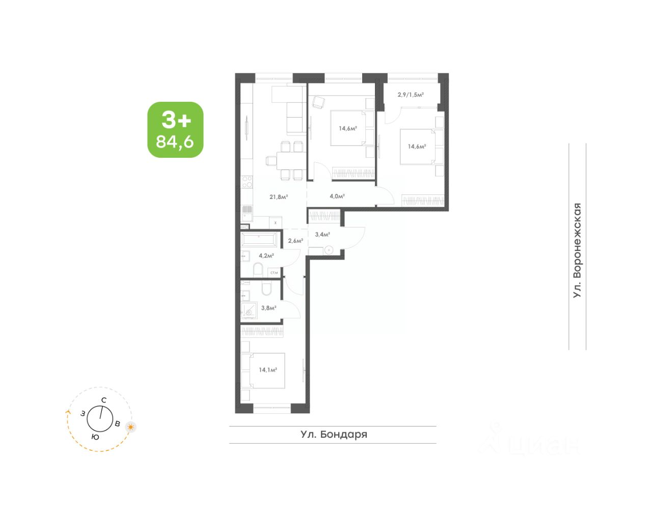 • Кухня-гостиная площадью 21,8 кв.м. станет сердцем дома, создавая атмосферу уюта для семейных вечеров;