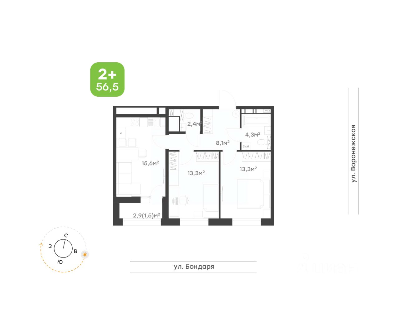 56,5 м²