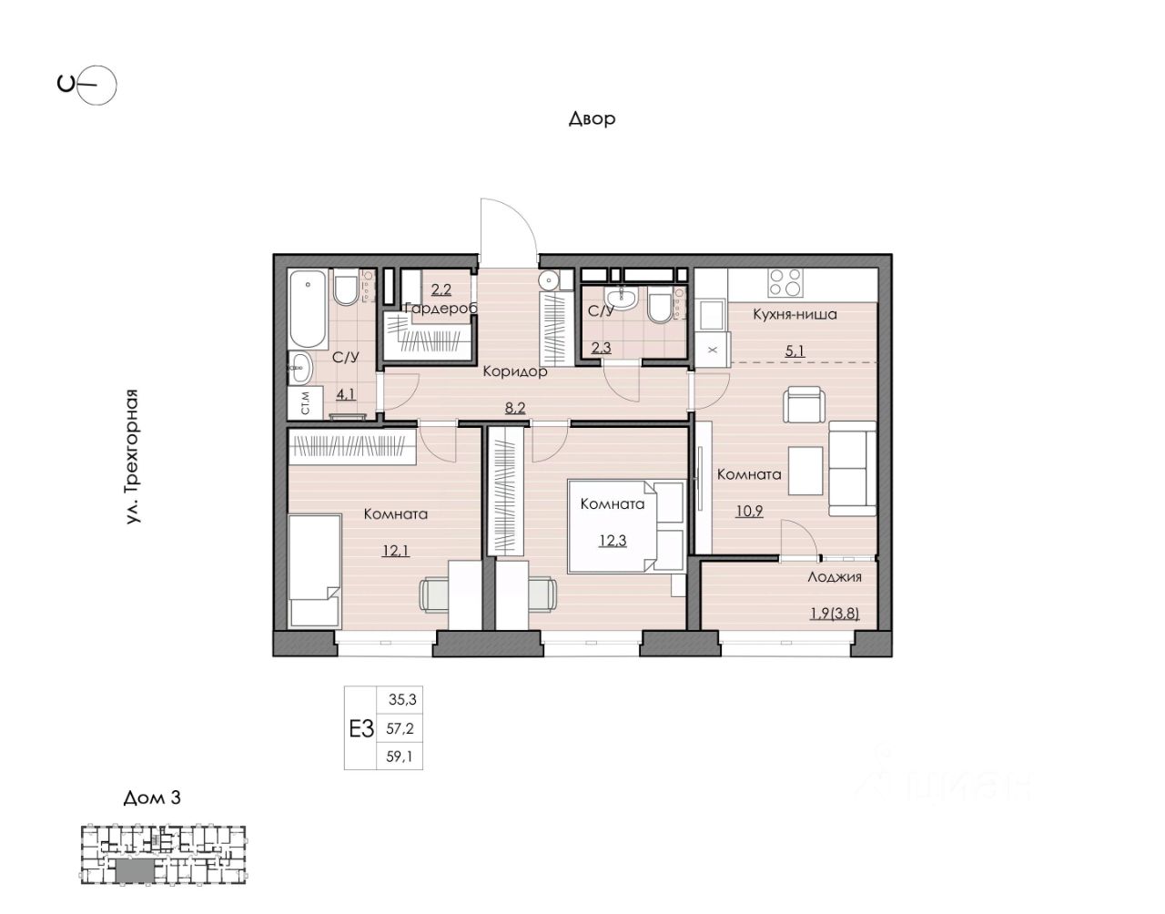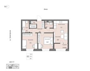 2,5-комнатная квартира для семьи с ребёнком; Кухня-гостиная с зонированием мест для готовки и отдыха; Гардероб и гардеробные ниши позволят не тратиться на дополнительные шкафы и комоды и сохранить полезную площадь; Жилые комнаты легко вместят всю необходимую мебель для отдыха, учёбы и работы; Два санузла