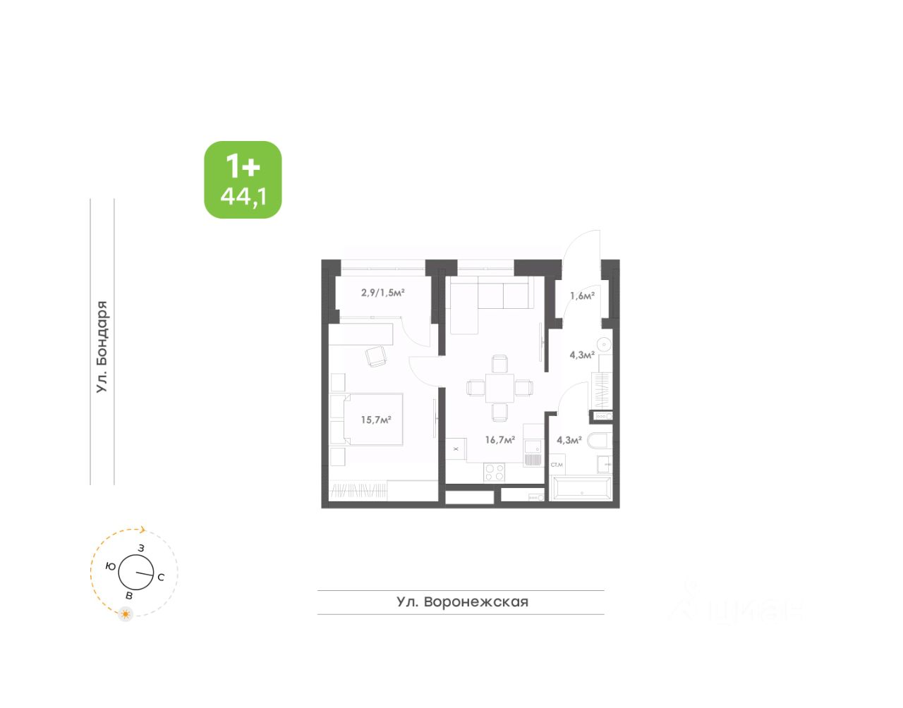 • Отдельная спальня с местом под хранение и выходом на лоджию;