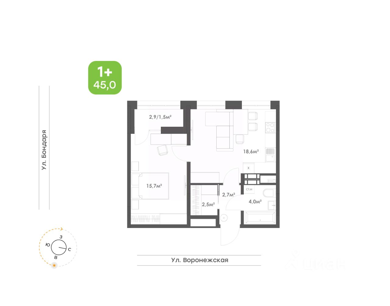 • Большая кухня-гостиная 18,6 кв.м с двумя окнами создаст удобное пространство для общения и кулинарных экспериментов;