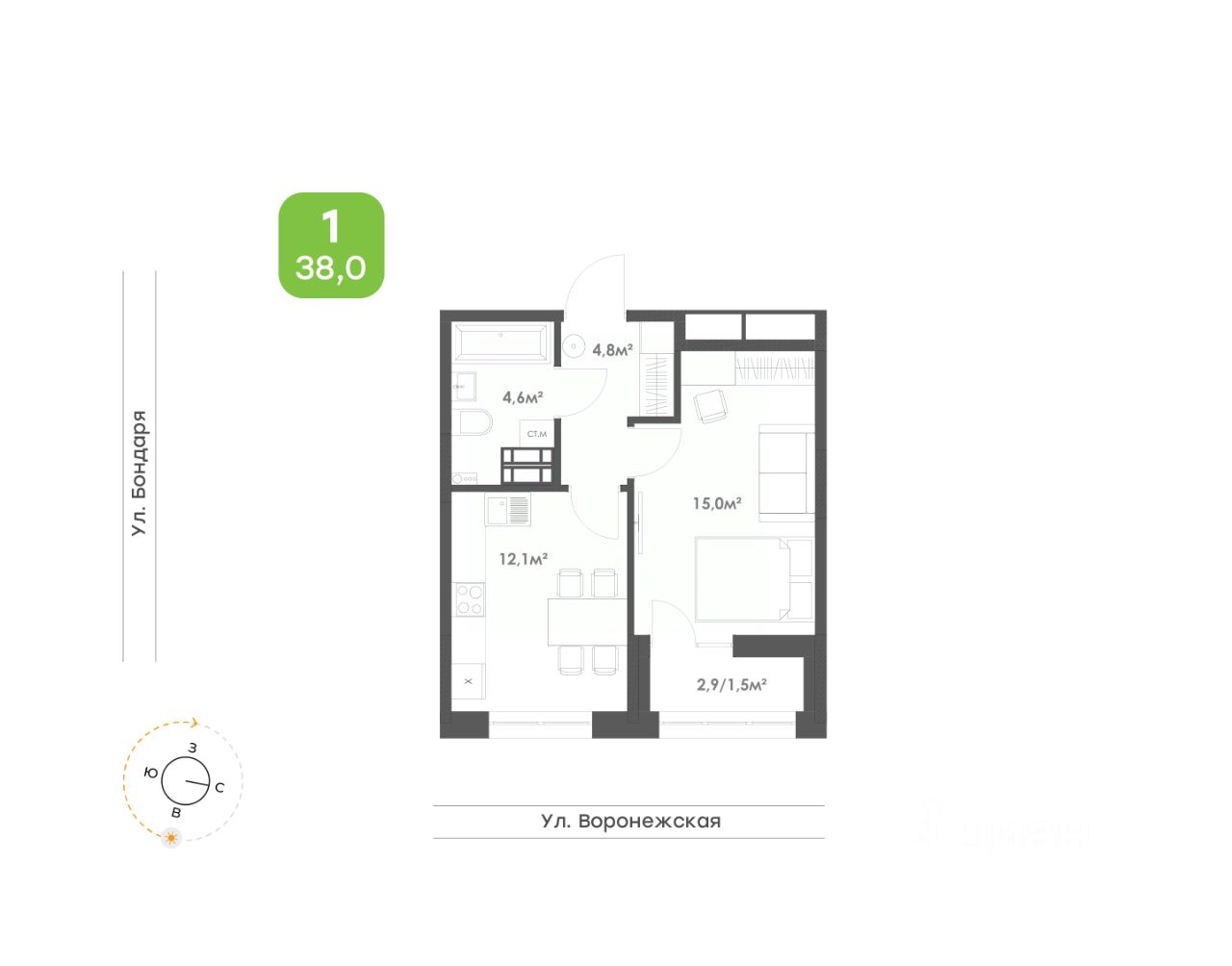 Классическая 1-комнатная квартира с окнами, выходящими на ул. Воронежскую