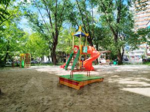 - уютный зелёный двор с детской площадкой и парковкой для машин, с южной стороны дома - зелёная зона со спортивными тренажёрами;