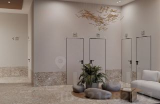 Стильное пространство холла с высоким потолком, французскими окнами и качественной отделкой.
