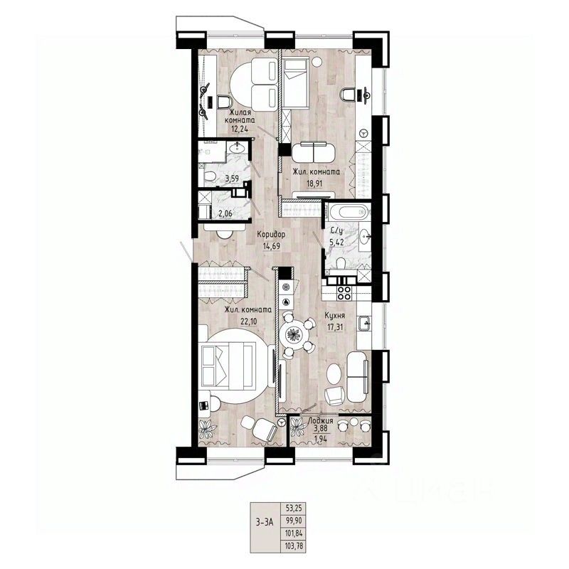 Квартира свободной планировки для воплощения индивидуального дизайна. Установлена входная дверь, радиаторы отопления, приборы учёта, стеклопакеты в алюминиевом профиле. Выложены стены сан.узла.