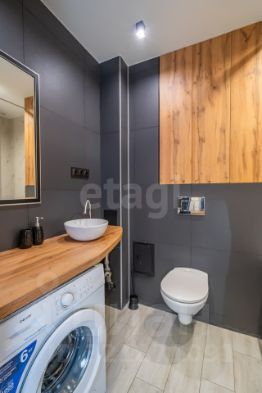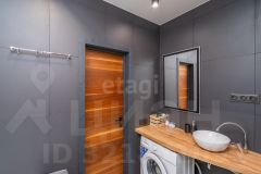 • современная ванная, отделанная дорогим керамогранитом, с деревянной стойкой и дизайнерской раковиной.