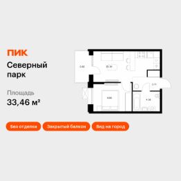 Продаётся 1-комн. квартира площадью 33,46 кв.м на 6 этаже 10 этажного дома (Корпус 10, Секция 1) проекта ПИК Северный парк. Светлый просторный подъезд на уровне земли, функциональная планировка, большие окна, без отделки.