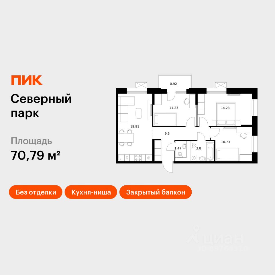 Продаётся 3-комн. квартира площадью 70,79 кв.м на 6 этаже 10 этажного дома (Корпус 10, Секция 2) проекта ПИК Северный парк. Светлый просторный подъезд на уровне земли, функциональная планировка, большие окна, без отделки.