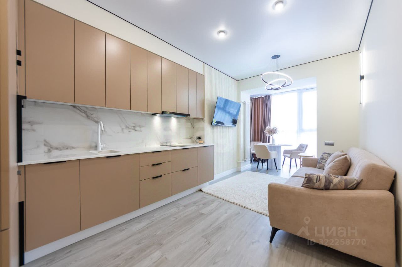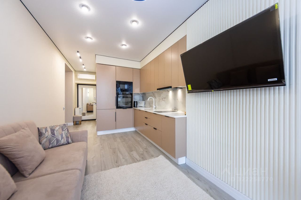Просторная кухня-гостиная: Встроенная техника (керамогранит), TV-зона с мягким диваном.