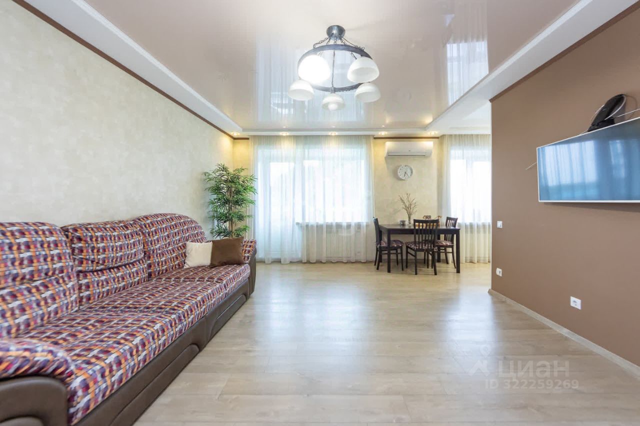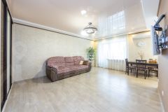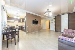 * Кухня-гостиная: Просторная. Свет льется через окна. Готовить удобно. Есть где сесть всем. Стол большой. Места хватит. Современно. Чисто.
