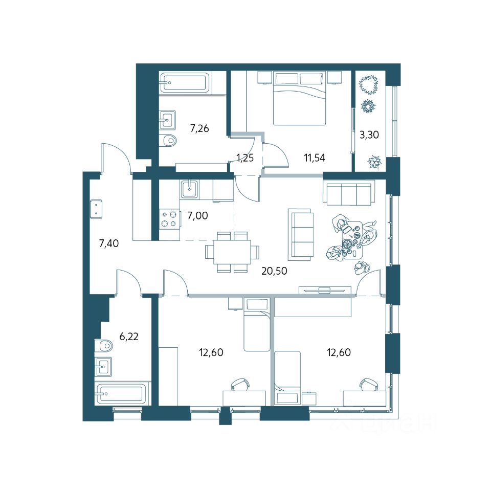 2 изолированных спальных комнаты площадью 12,6м2, мастер-спальня с выходом на лоджию площадью 11.54м2.