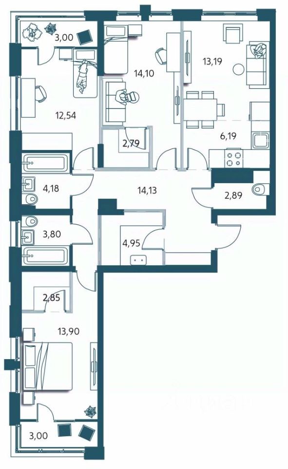 4-комн. квартира с рациональной планировкой площадью 101,51 м2.