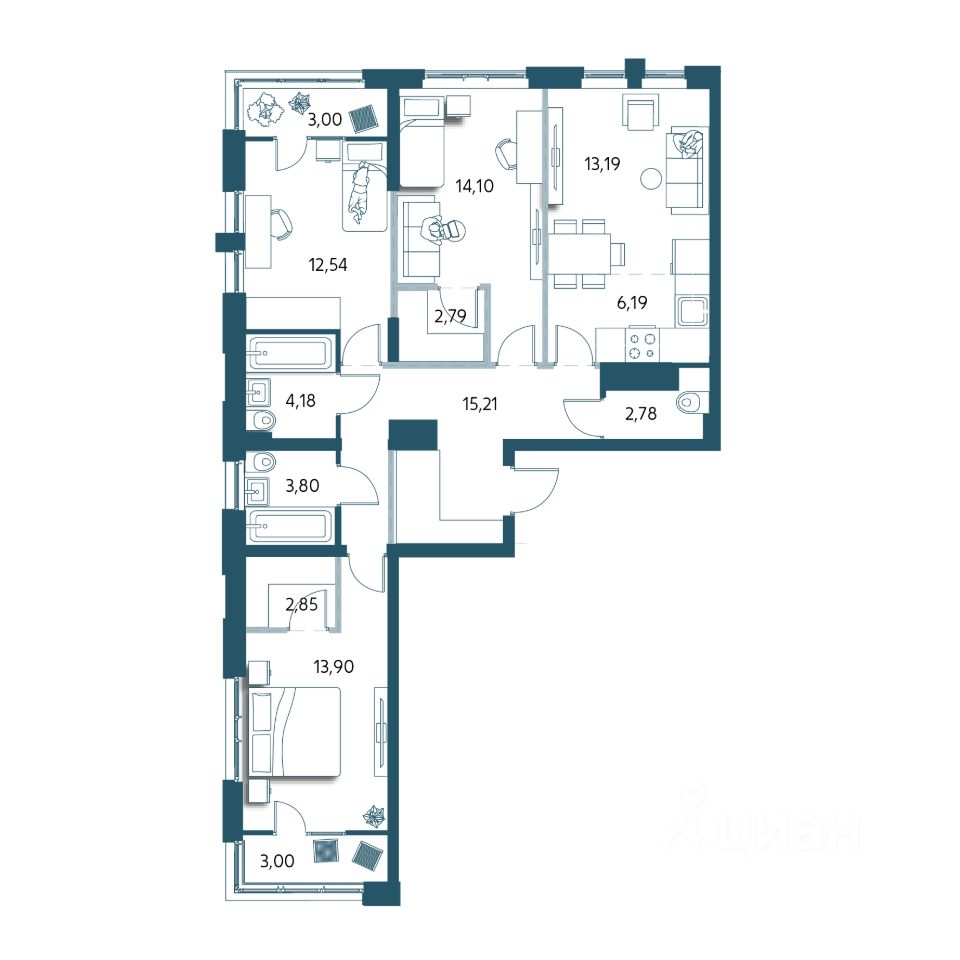 4-комн. квартира с рациональной планировкой площадью 97,53 м2.