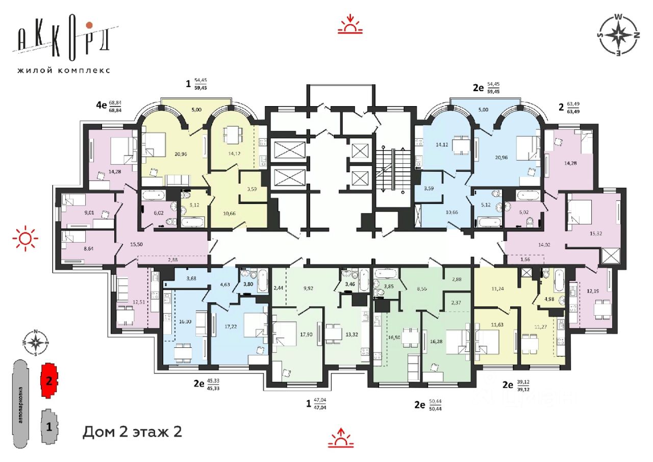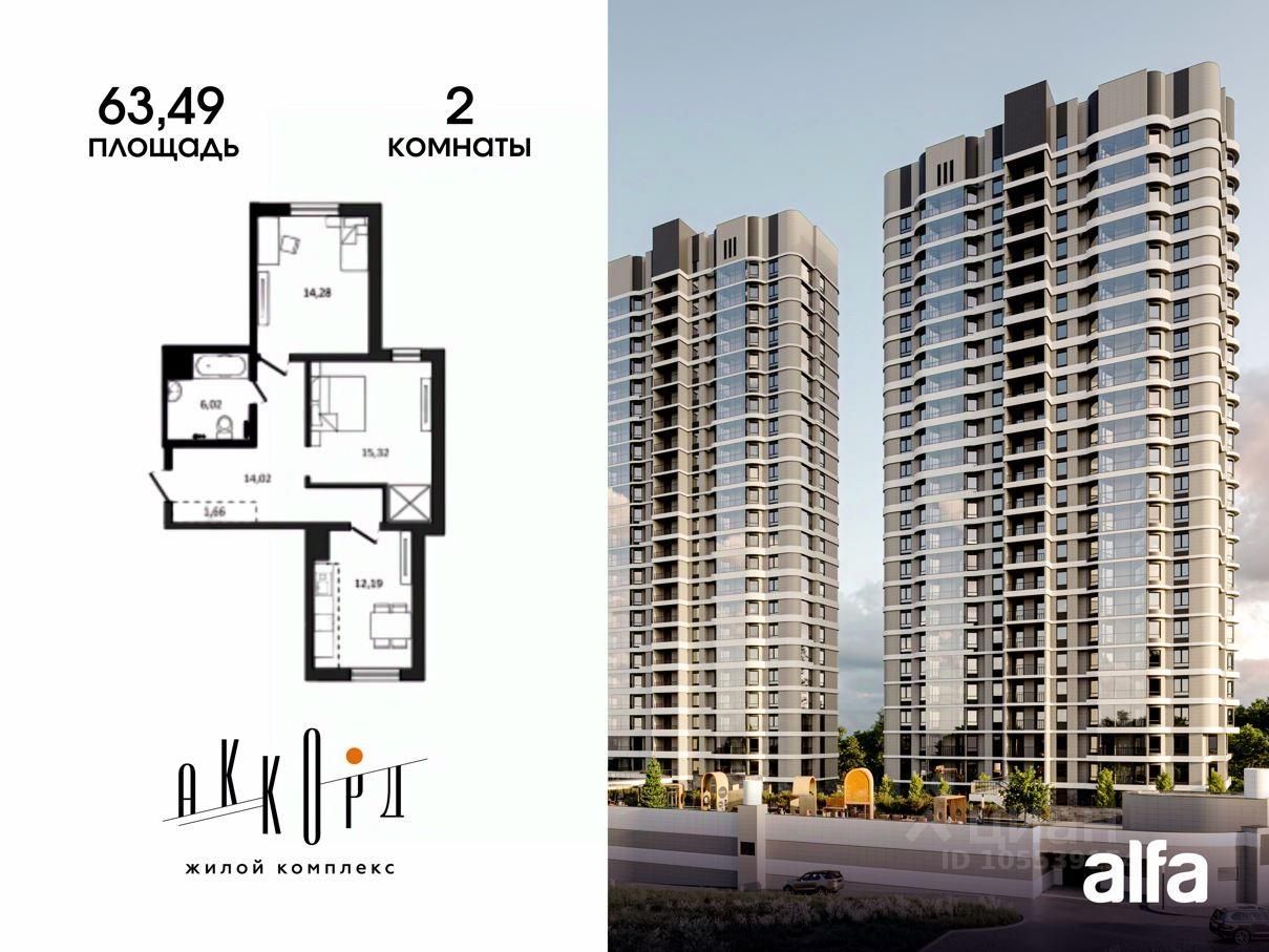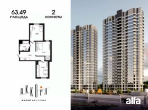 Продаётся 2-комнатная квартира 63,49 м2 от застройщика в жилом комплексе "Аккорд".