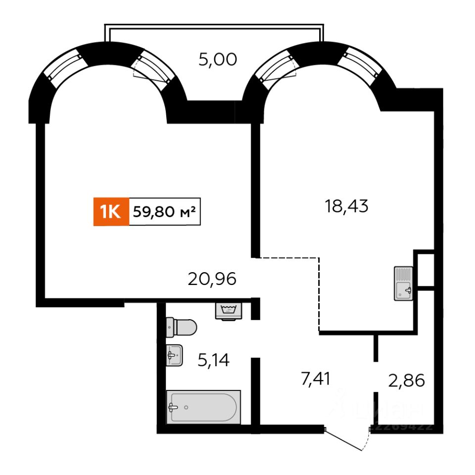Продаётся 1-комнатная квартира 59,45 м2 от застройщика в жилом комплексе "Аккорд".