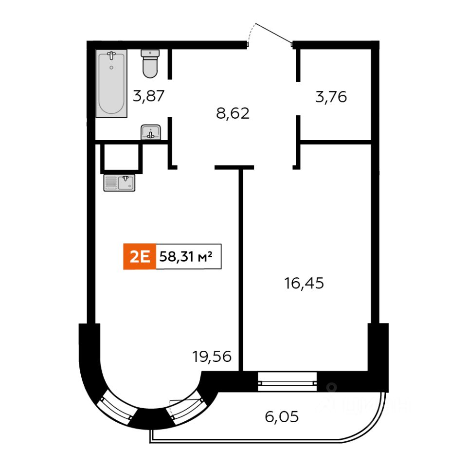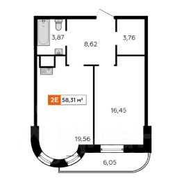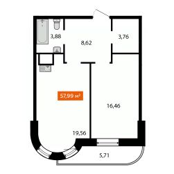 Продаётся 2-комнатная квартира 58,19 м2 от застройщика в жилом комплексе "Аккорд".