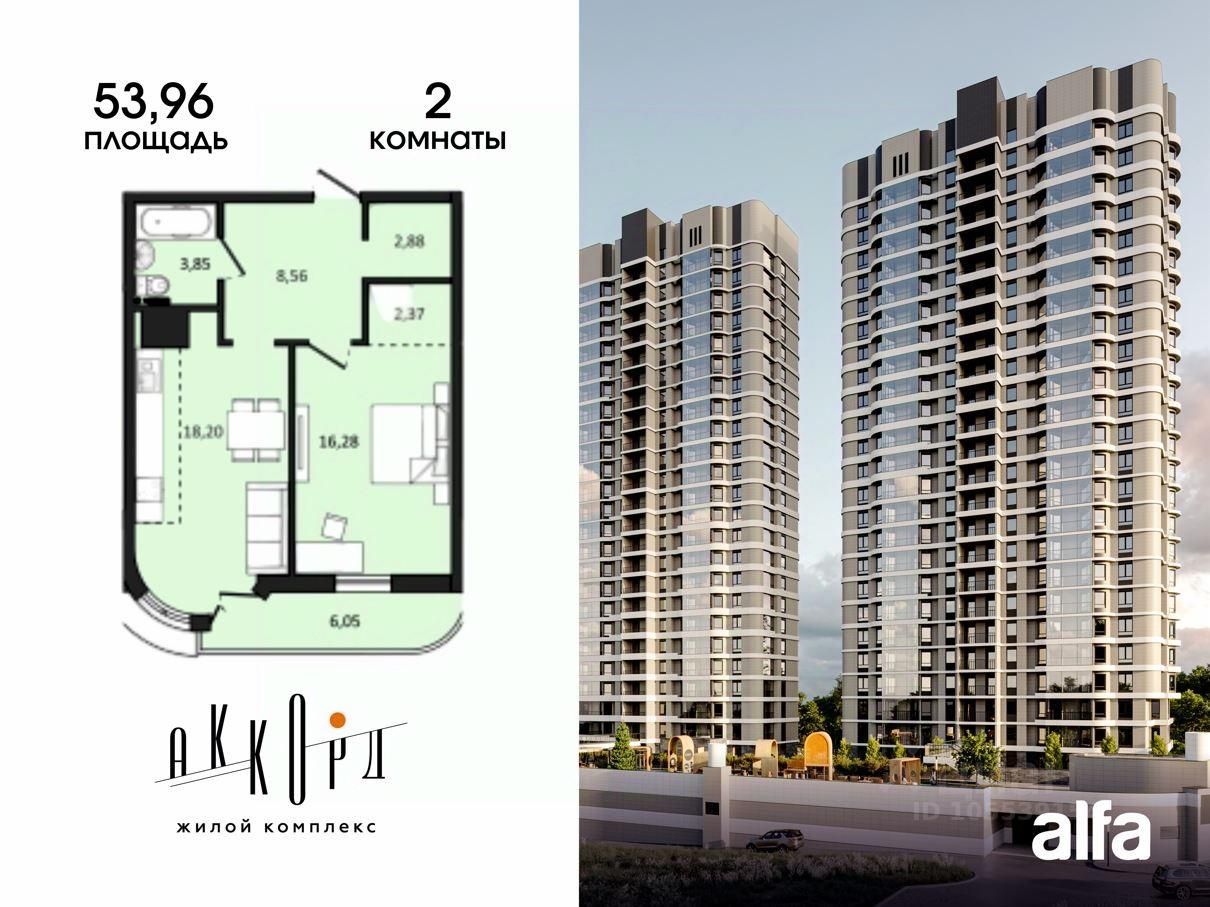 Продаётся 2-комнатная квартира 58,19 м2 от застройщика в жилом комплексе "Аккорд".