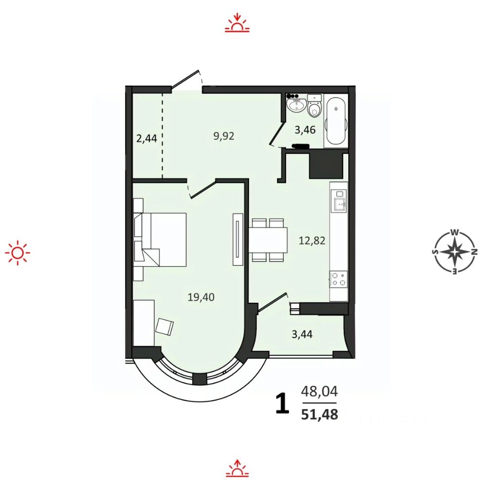 Продаётся 1-комнатная квартира 51,48 м2 от застройщика в жилом комплексе "Аккорд".