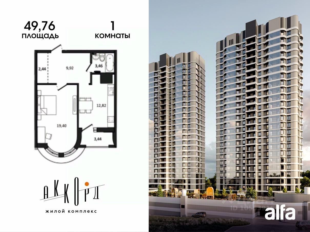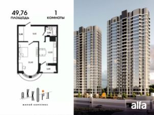 Продаётся 1-комнатная квартира 51,48 м2 от застройщика в жилом комплексе "Аккорд".