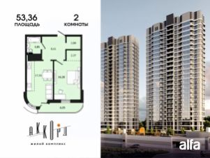 Продаётся 2-комнатная квартира 57,59 м2 от застройщика в жилом комплексе "Аккорд".