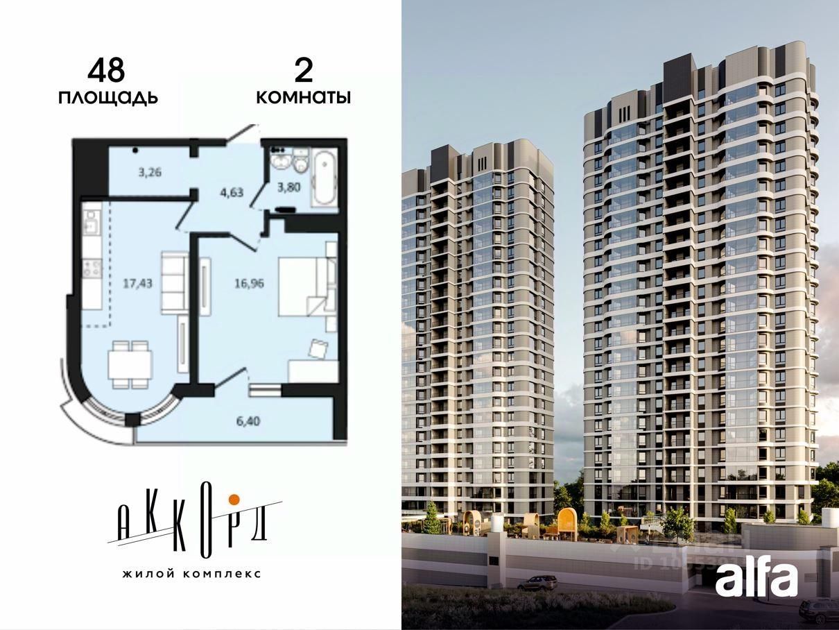 Продаётся 2-комнатная квартира 52,48 м2 от застройщика в жилом комплексе "Аккорд".