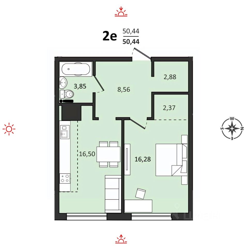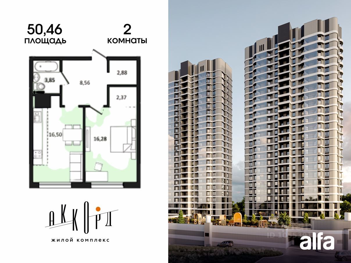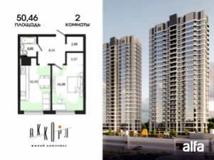 Продаётся 2-комнатная квартира 50,46 м2 от застройщика в жилом комплексе "Аккорд".