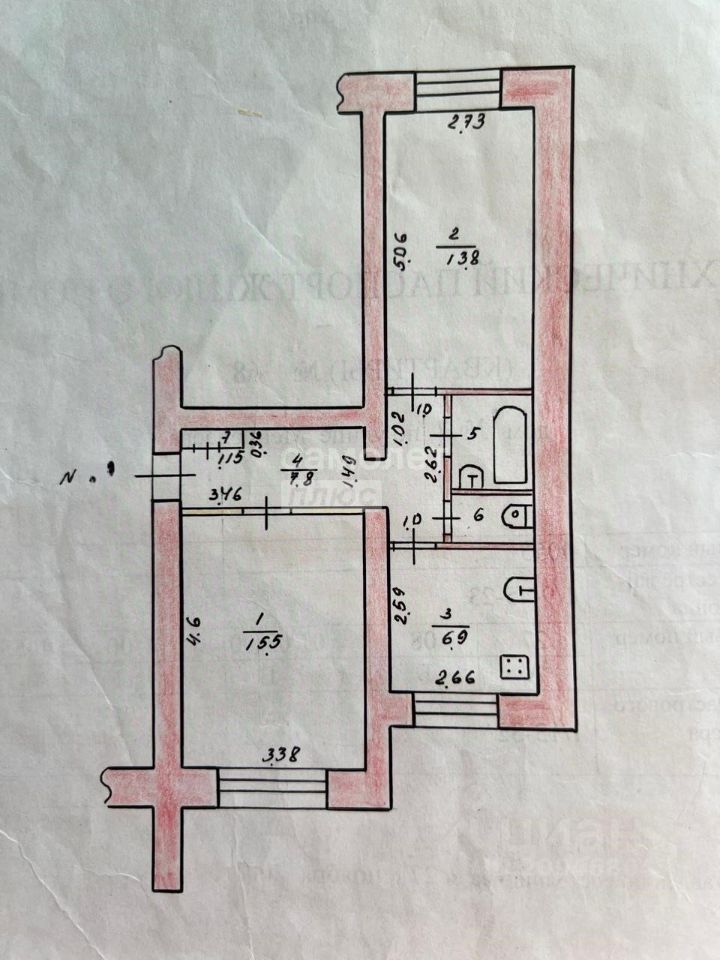 Площадь квартиры 48,3 кв.м., кухня 6,9. кв.м , высота потолков - 2,6 кв.м.