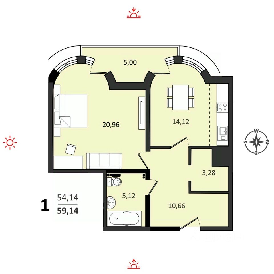 Продаётся 1-комнатная квартира 59,14 м2 от застройщика в жилом комплексе "Аккорд".