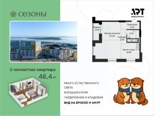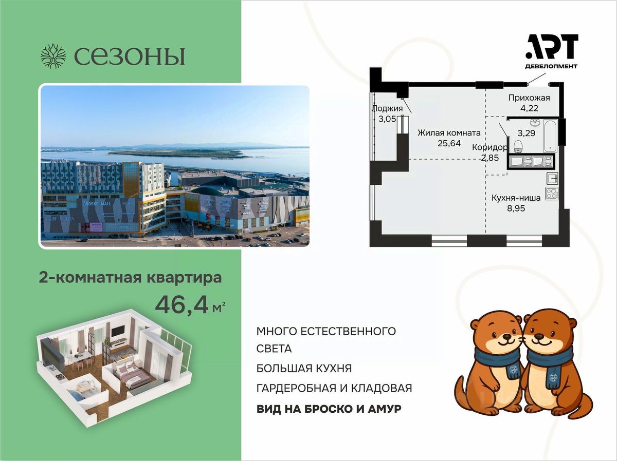 Осенние скидки! Выгода до 1,9 миллиона рублей. Стартовые цены - от 7,5 миллионов рублей. Квартира 46,48 м2 свободной планировки с видами на Амур и Броско. - большая кухня - много естественного света - панорамное остекление лоджии - удачная планировка - вид на Броско и Амур ДВ ипотeка от 0,6%, семейная ипотека от 4,6%! Льготная ипотека без удорожания Семейная комбо-ипотека до 15 млн 0% индивидуальное предложение от застройщика, трейд-ин - 3 минуты до центра на авто - 11 маршрутов общественного транспорта - 2 минуты пешком до Броско - 5 минут пешком до школы - 3 минуты пешком до детского сада - 30 шагов до паркинга в доме - 1 взгляд до вдохновляющих видов ЗАКРЫТАЯ ТЕРРИТОРИЯ Территория двора огорожена забором, и будет много камер. Доступ на территорию будет регулироваться воротами с индивидуальным доступом, отдельно будет настроен доступ в дом, паркинг, велосипедные и колясочные пространства. ИНТЕРЕСНЫЙ ДВОР, АТМОСФЕРНЫЕ ПРОСТРАНСТВА ДОМА Стильное пространство холла с высоким потолком, французскими окнами и качественной отделкой. По территории двора ограничен проезд, бОльшая часть парковок находится под землей. Предусмотрены также и гостевые парковки они расположены снаружи комплекса вдоль коммерческих помещений. Авторская детская площадка: длинная горка, тактильная дорожка, батуты, скалодром и канаты. Двор будет уникальным. Есть воркаут-зона для занятий спортом, и есть место где можно почитать книгу и тропа в травах, для создания которой растения с цветением по разным сезонам высадят согласно дендроплану. АРХИТЕКТУРА, ПЛАНИРОВКИ Комплекс состоит из трех зданий переменной этажности, второе и третье здание соединены двухэтажным стилобатом, в котором разместятся компании для ежедневного комфорта жителей дома: магазины, кофейня, салон красоты, детское обучение и досуг. Мы видим ценность в долговечных фасадных решениях, поэтому выбрали сочетание керамогранита и клинкерного кирпича. Предусмотрели ненавязчивую пластику фасада, архитектурную подсветку в специальных нишах. ИЗ ТЕПЛОЙ КВАРТИРЫ В ТЕПЛЫЙ ПАРКИНГ В подземный паркинг спускаются все три быстрых лифта. Пробок не предвидится даже в час пик. КАЧЕСТВЕННОЕ ОКРУЖЕНИЕ От Сезонов до школы ноль перекрестков, рядом можно поесть разнообразно и вкусно, сводить ребенка в игровое пространство, купить продукты в минимаркете или в гипермаркете Броско. Кинотеатр через дорогу, новый корпус Броско Волна. У вас много возможностей. Все продажи ведутся через безопасные эскроу-счета.