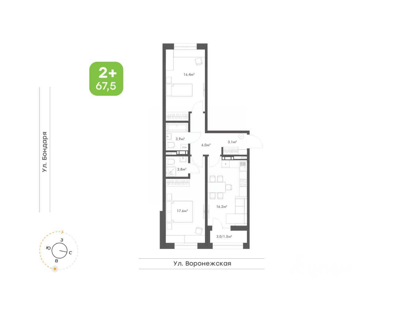 • Кухня-гостиная площадью 16,2 кв.м. с выходом на лоджию станет уютным местом для семейных встреч и отдыха;