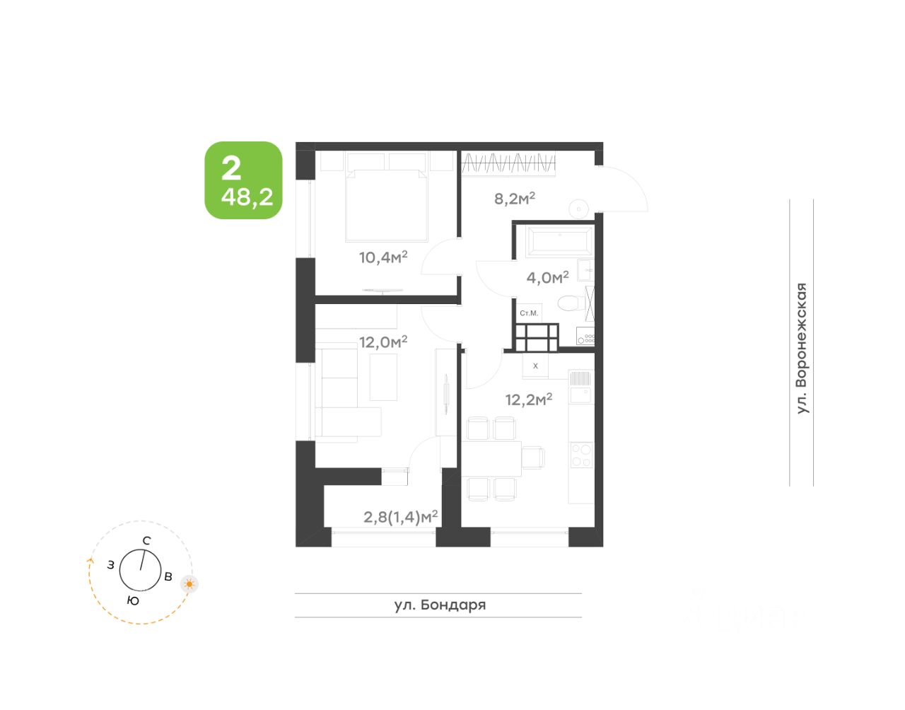 Уютная 2-комнатная квартира, обеспечивающая максимальный комфорт для проживания. • Вместительный коридор 8,2 кв.м. с зоной хранения позволит удобно разместить вещи; • Классическая кухня с местом для обеденной зоны станет прекрасным местом для уютных вечеров; • Светлая гостиная с выходом на лоджию и видом на ул. Бондаря - идеальное место для отдыха; • Спальная комната с местом для хранения; • Совмещенный санузел 4 кв.м. подарит дополнительное удобство; • Идеальное решение для тех, кто ценит комфорт и функциональность в каждой детали.