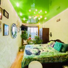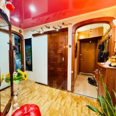 потолки натяжные, пол частично уложен керамической плиткой, в комнатах и кухне линолеум и ламинат, балкон и лоджия остеклены пластиком с наружной и внутренней отделкой деревом, все двери на балкон в пол из натуральных материалов (дерево) с двойным остеклением. Окна заменены на дерево с двойным остеклением (качественно и красиво), все межкомнатные двери в квартире из натурального лакированного дерева (двери-купе).
