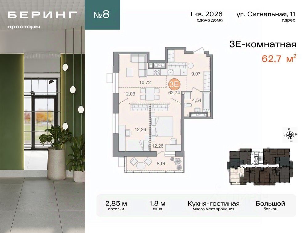 Комфортабельная светлая 2-комнатная квартира (евротрешка) 62 м². Здесь 2 отдельных спальни, просторная кухня-гостиная, комфортный санузел и большой балкон с панорамным видом, который можно оборудовать как зону отдыха или рабочее место. В квартире предусмотрено много места для хранения вещей