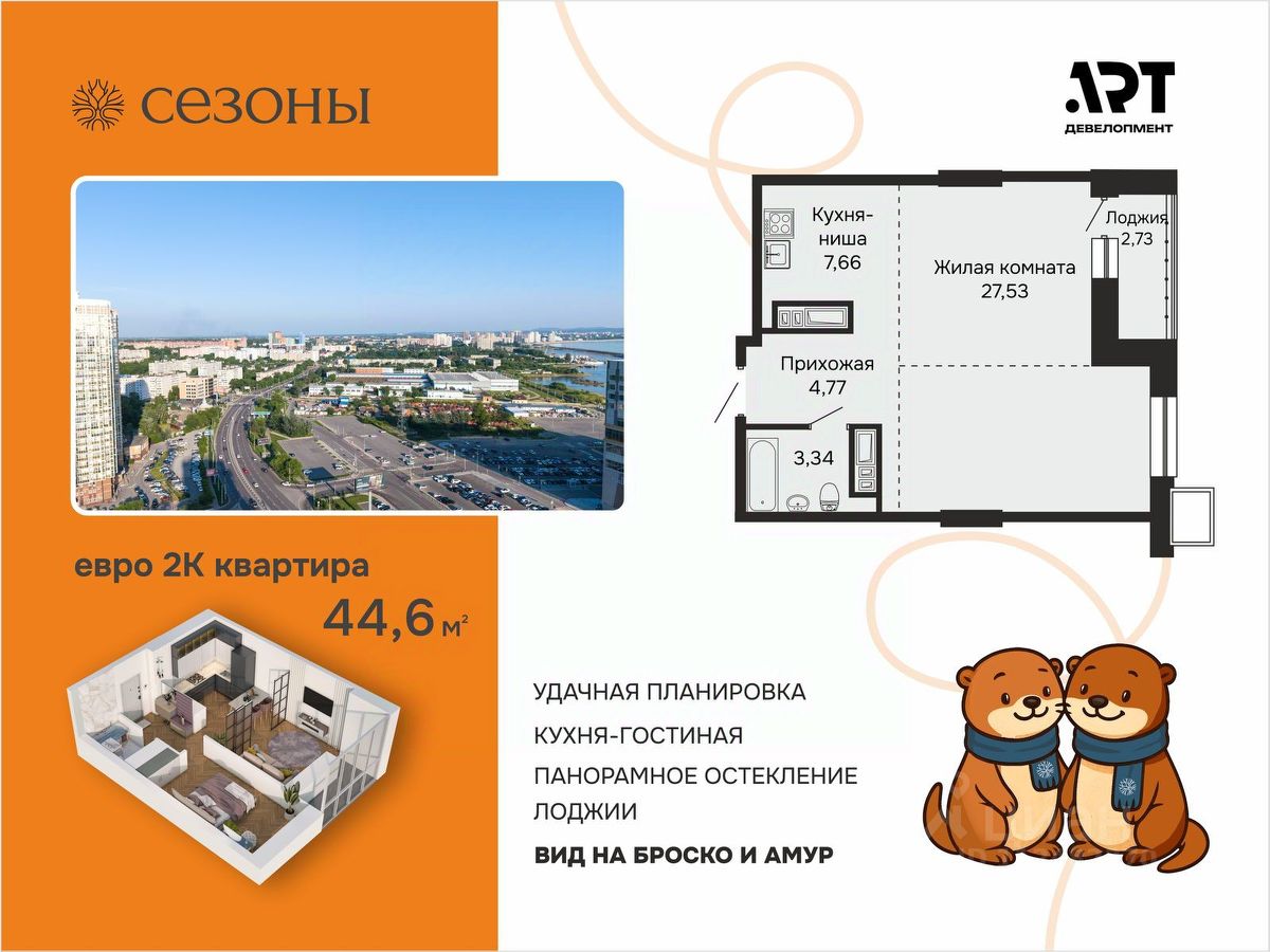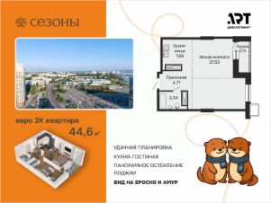 Осенние скидки! Выгода до 1,9 миллиона рублей. Стартовые цены - от 7,5 миллионов рублей. Квартира 47,25 м2 свободной планировки с видами на Броско и Амур
