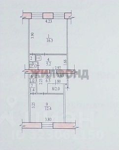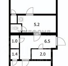 В квартире удобная изолированная планировка: комната 1 (16.5 м2), комната 2 (12.4 м2), коридор (6.5 м2), кухня (5.2 м2), санузел (1 м2), душ (1 м2).