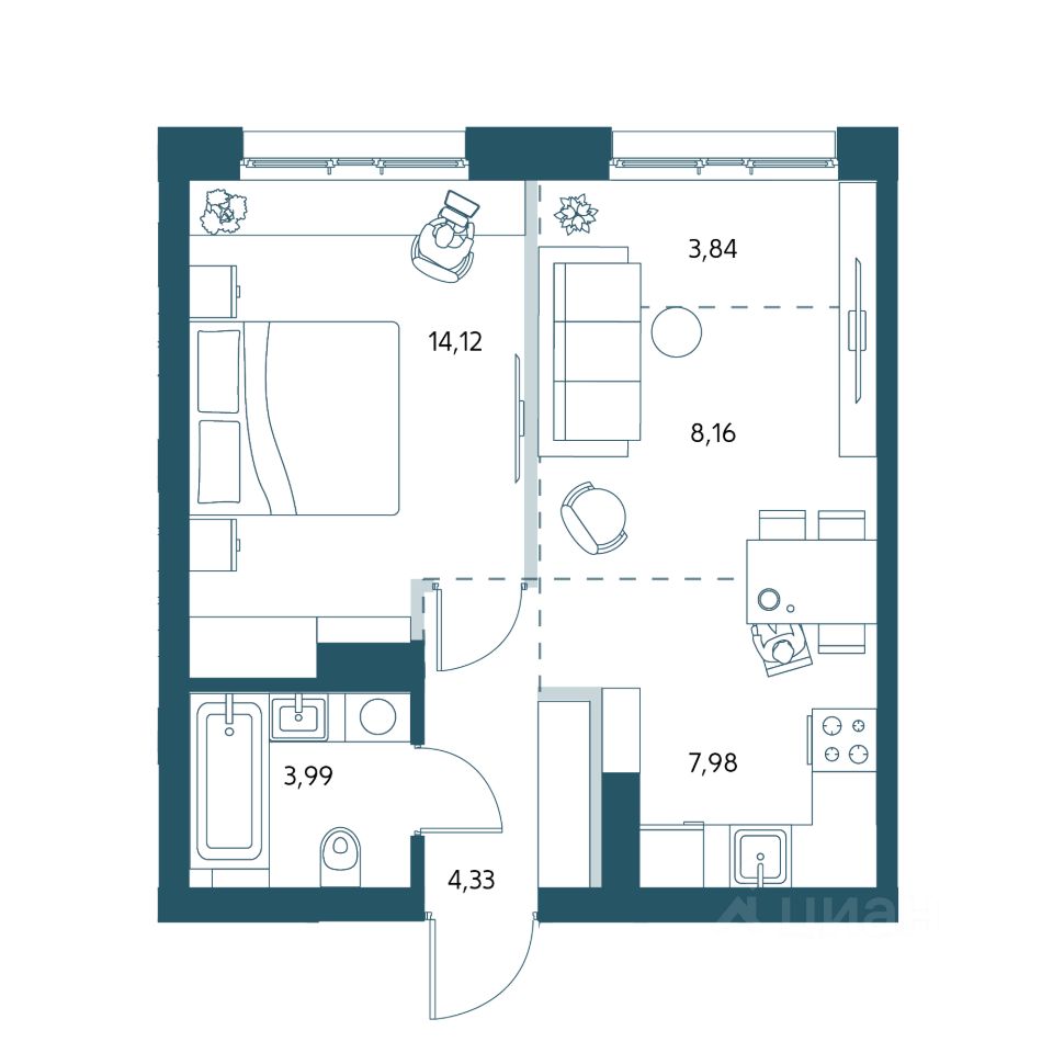 Однокомнатная квартира площадью 42,42м2.