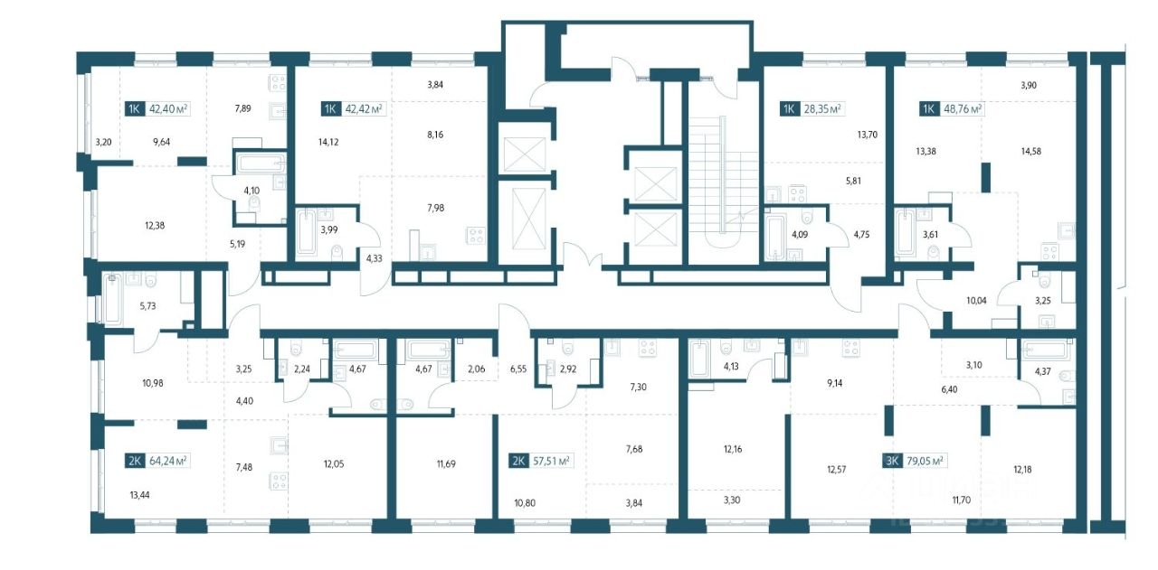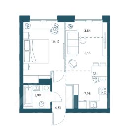 Однокомнатная квартира площадью 42,42м2.