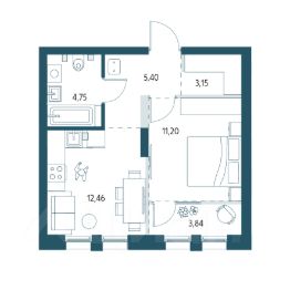 Однокомнатная квартира площадью 40,80м2.
