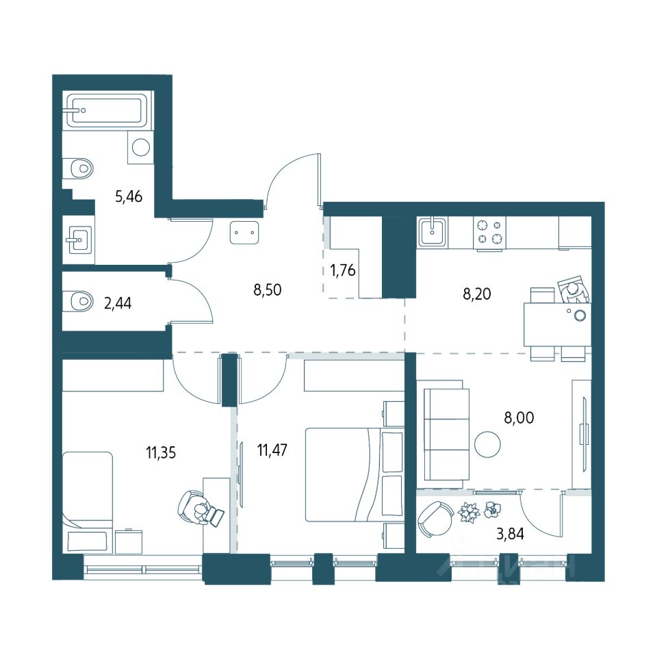 Двухкомнатная квартира площадью 59,1м2.